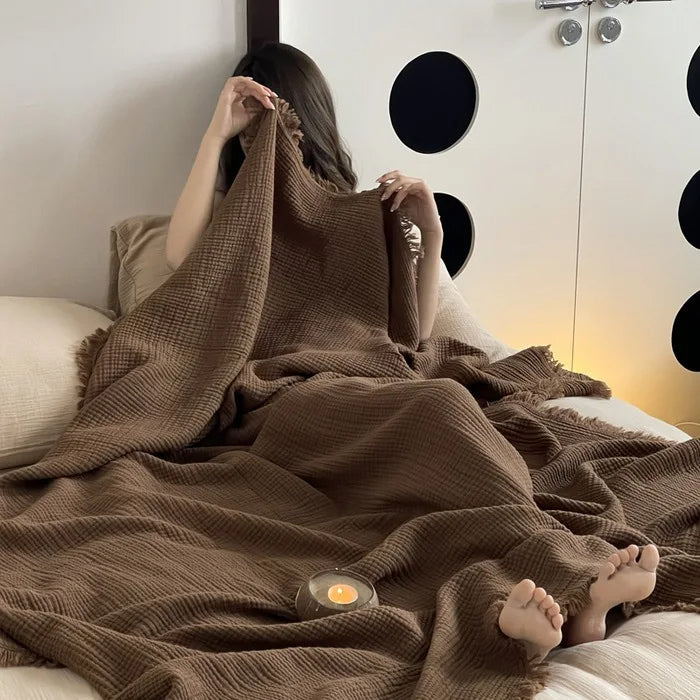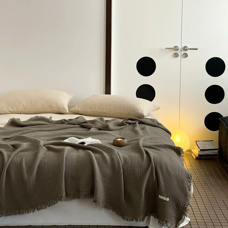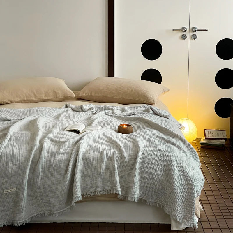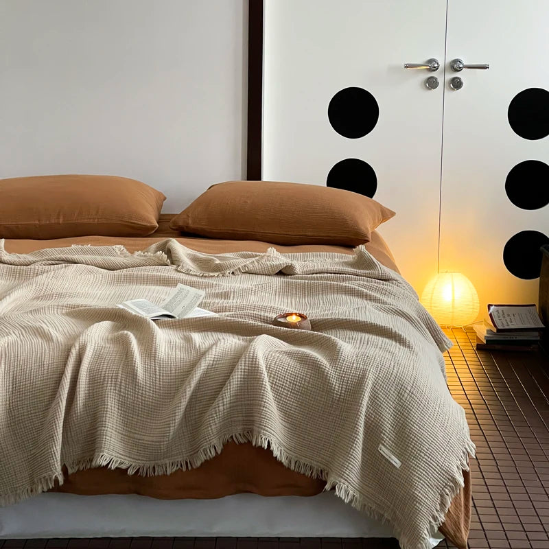 This cotton throw blanket is your go-to for warm nights. Textured, tassel-trimmed, and easy to layer.